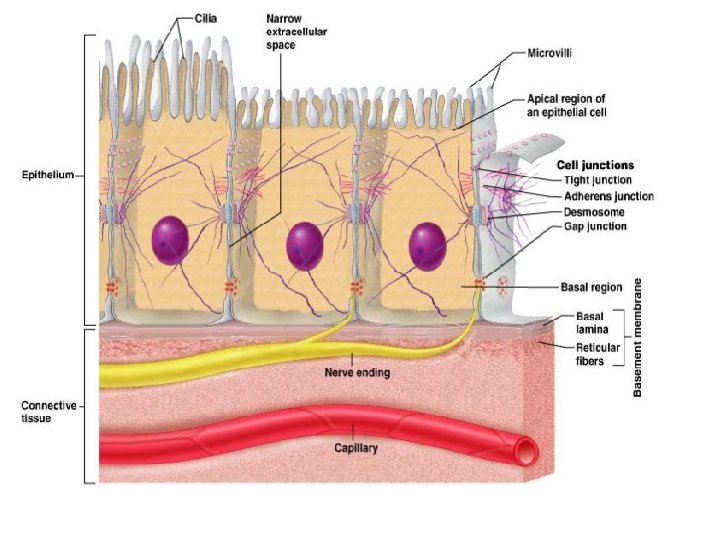 Special Characteristics of Epithelia Cellularity cells are in close contact with each other with little or no intercellular space between them Specialized contacts may have junctions for both attachment and communication Polarity epithelial tissues always have an apical and basal surface Support by connective tissue at the basal surface, both the epithelial tissue and the connective tissue contribute to the basement membrane Avascular nutrients must diffuse Innervated Regeneration epithelial tissues have a high capacity for regeneration