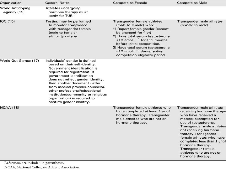 NCAA transgender athletes Document “NCAA Inclusion of Transgender Student‐Athletes” outlines policy Transgender male athletes not utilizing hormonal therapy for gender transition may participate on a men’s or women’s team Transgender female athletes not utilizing hormonal therapy for gender transition may not participate on a women’s team NCAA inclusion of transgender student-athletes. NCAA Office of Inclusion, 2011