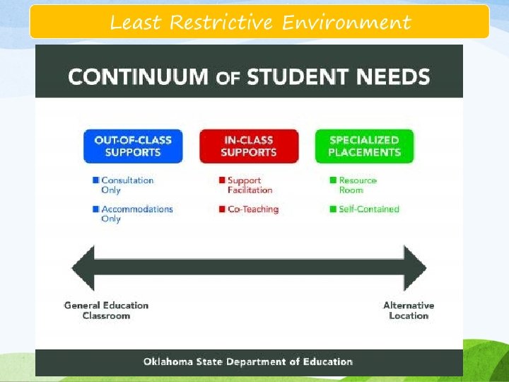Placement Decisions • LRE decisions are made individually for each student. • The LRE is the appropriate balance of settings and services to meet the student’s individual needs. • The district should have an array of services and a continuum of educational setting options available to meet the individual LRE needs of each student.