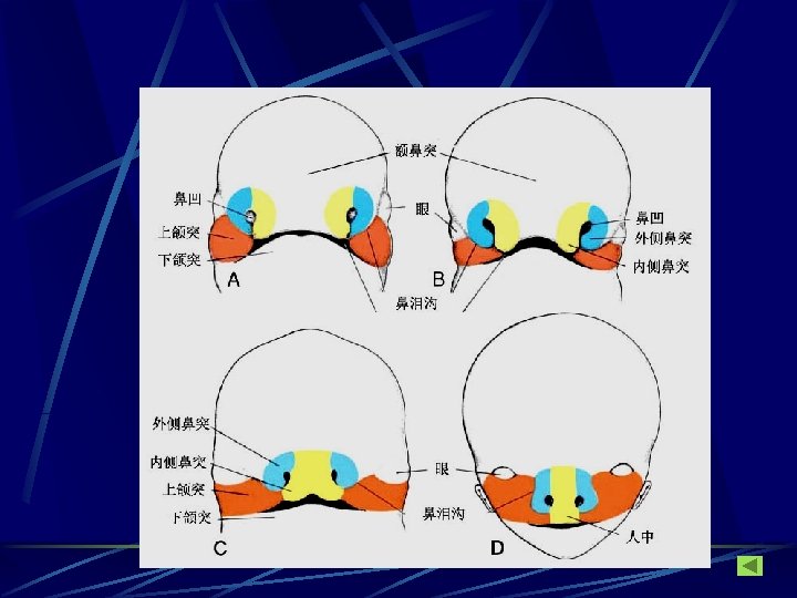 鼻窝 Nasal pit 内侧鼻突 Medial nasal prominence 外侧鼻突 lateral nasal prominence primitive nasal cavity 鼻泪沟 Nasolacrimal groove