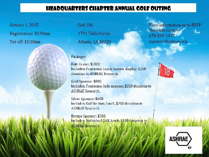 Giving Categories • Gold, Silver, Bronze, Pro, 9 -Iron, whatever – Set Levels that automatically include everything • Hole Sponsorships, 4 -some, 20 mulligans, lunch and $250 donation to ASHRAE RP The work is already done for you!