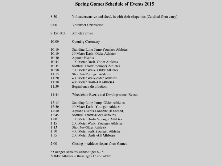 One-On-Ones • Volunteers responsibility to get athlete to their events and STAY with them. – If there is down time, take your athlete to do something fun (crafts, motor room, etc) • • When one-on-ones arrive – Getting hold of host teacher ask when they want their student back – Carry cell phone with you in case you need to get hold of athletes teacher – Go sit down, orientation – Get placed with teacher – Wait for teachers name to be called at – Walking on the left hand side of the track to get the athlete – After you pick them up go on the right side of the track – Go back to the seats listen to opening ceremony where they are dismissed to where the athletes name tag has them going to. Things to remember: – If athlete is a swimmer, you take them to locker room (you do not have to help them change), and then just wait for them in the pool. – After each event, make sure athlete gets ribbon. – Phones- take pictures but BE RESPECTFUL. Do not take a selfie with your athlete if they don’t want to. Live the moment don’t be obsessed about getting an instagram pic for the day