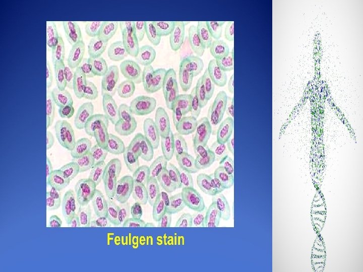 Feulgen Stain � The Feulgen nuclear reaction for the specific staining of DNA in cytohistochemical samples in situ was introduced by Feulgen and Rossenbeck in 1924. � These authors devised a chemical treatment, HCI hydrolysis, to produce free aldehyde groups in the DNA backbone structure that could be detected by a colored reaction for aldehydes.