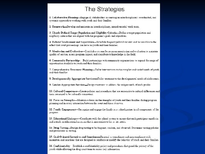 Differences from General Juvenile Courts n n n n Small caseloads Frequent hearings Immediate sanctions for violations of agreements Family involvement Elements of restorative justice (community participation in gun courts) Treatment services Mutual accountability between juveniles in treatment and treatment service providers Stronger role for judge as therapist and manager n n “intensive judicial supervision” Defense and prosecution are secondary parties to therapeutic concerns