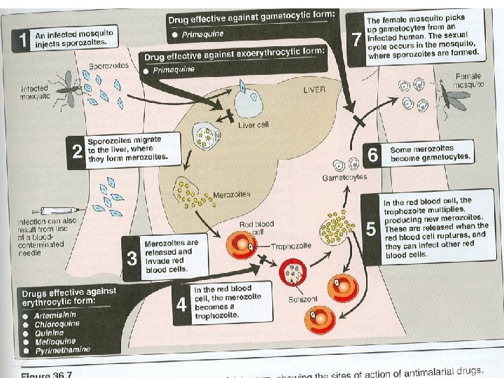 Quiz? • Regarding drugs used for malaria, which one of the following statements is false? (A) Chloroquine is the drug of choice for acute attacks of non falciparum malaria (B) Cinchonism is associated with the use of quinine (C) Hemolysis has occurred with primaquine in patients deficient in G 6 P dehydrogenase (D) Mefloquine is used for prophylaxis in regions where chloroquine resistance occurs (E) Quinine is contraindicated in pregnancy
