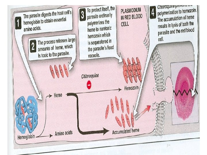 Chloroquine and amodiaquine potent blood schizontocide. At the acid p. H of the lysosome it is converted into protonated form, trapped in the parasite. Inhibits digestion of haemoglobin by the parasite AA supply necessary for parasite viability. It also haem polymerase.