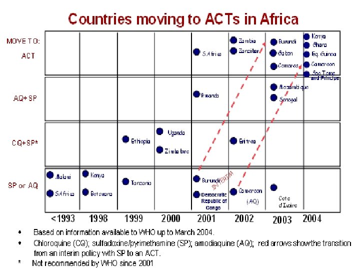 1. 2. 3. 4. 5. WHO recommends that all countries experiencing resistance to conventional monotherapies should use combination therapy, preferably containing artemisinins [ACTs -artemisinin-based combination therapies]. WHO recommends the following therapeutic options: Artemether/lumefantrine Artesunate+amodiaquine Artesunate+SP Artesunate+ mefloquine [area with low to moderate transmission. Amodiaquine+SP