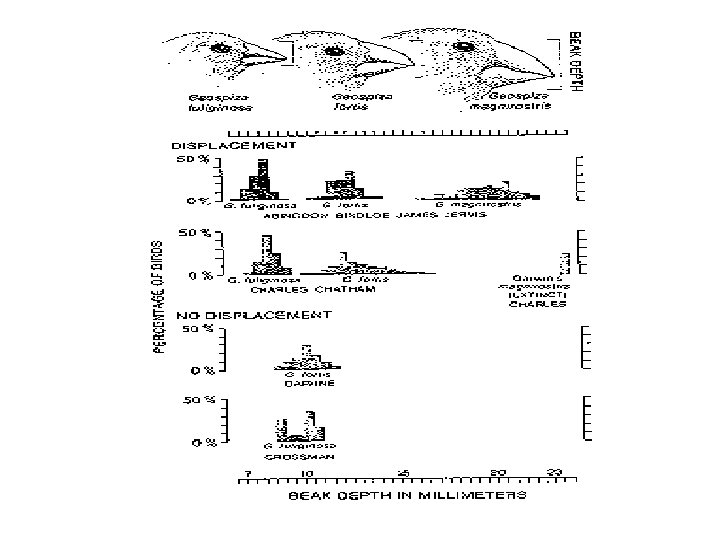 Conditions 1 and 3 have been demonstrated: The variation observed in G. fortis in isolation on Daphne greatly exceeds that observed on other islands. Heritability of the trait for beak morphology [which can range from 0 (no relation between parental and offspring morphology) to 1 (absolute relationship)] has been estimated as 0. 82. There is good tentative evidence for criterion 4. Peter and Rosemary Grant recently demonstrated that co-occurring finches diverged in beak morphology after a drought which greatly reduced seed abundance, relative to their respective beak shapes prior to the drought. There is, however, no way to deal with criterion 2 since there is only one Daphne and one Crossman. Satisfying this requirement would necessitate observing the same pattern on other islands like Daphne and Crossman.