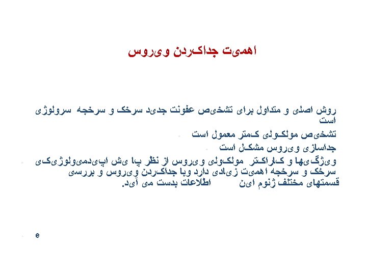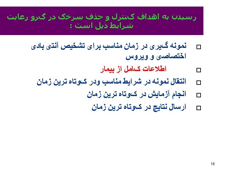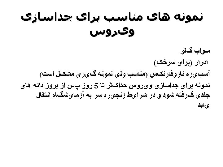 ﺷﻤﺎﺋی ﺍﺯ ﻋﻔﻮﻧﺖ ﺑﺎ ﻭیﺮﻭﺱ ﺳﺮﺧک Patients positive 100% Ig. G: serum 75% Ig. M: in serum 50% 25% Virus for culture from throat or urine -3 -1 1 3 5 7 Fever Rash ﺩﻭﺭﻩ کﻤﻮﻥ ﺭﻭﺯ 17 -8 (-3 to 5 days) 14 21 28 35 Day of illness** (0 to 5 days) **Day 0 = first day of rash ﺗکﻨیک ﺍﻻیﺰﺍ ﺭﻭﺵ ﺍﺳﺘﺎﻧﺪﺍﺭ ﺑﺮﺍی ﺗﺸﺨیﺺ ﺳﺮﺧک ﻭﺳﺮﺧﺠﻪ ﺍﺳﺖ 60 90