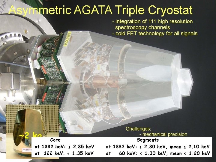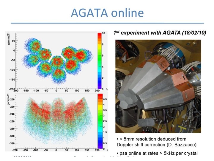 AGATA (Advanced GAmma Tracking Array) 4 -array for Nuclear Physics Experiments at European accelerators providing radioactive and high-intensity stable beams Main features of AGATA Efficiency: 43% (M =1) 28% (M =30) today’s arrays ~10% (gain ~4) Peak/Total: 58% (M =1) today ~55% 5% (gain ~1000) 49% (M =30) 40% Angular Resolution: ~1º FWHM (1 Me. V, v/c=50%) ~ 6 ke. V !!! today ~40 ke. V Rates: 3 MHz (M =1) 300 k. Hz (M =30) today 1 MHz 20 k. Hz • 180 large volume 36 -fold segmented Ge crystals in 60 triple-clusters • Digital electronics and sophisticated Pulse Shape Analysis algorithms allow • Operation of Ge detectors in position sensitive mode -ray tracking