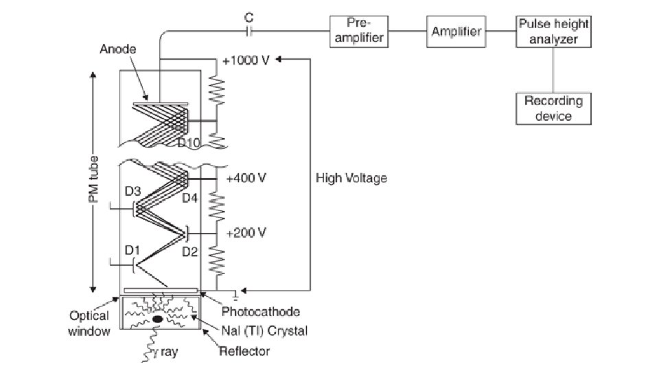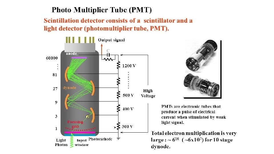 PMT(FOTOMULTİPLAYER TÜP) 1 - Işın giriş penceresinden tüpe girer. 2 -Fotokatoda çarpan ışınlar e koparır. 3 - Elektronlar anoda kadar dinodlar arasında yükseltilerek ilerler. 4 - Son olarak dinodlar arasında çoğalan bu elektronlar anotta toplanır. Sonuçta anot çıkışında bir elektrik sinyali oluşur.