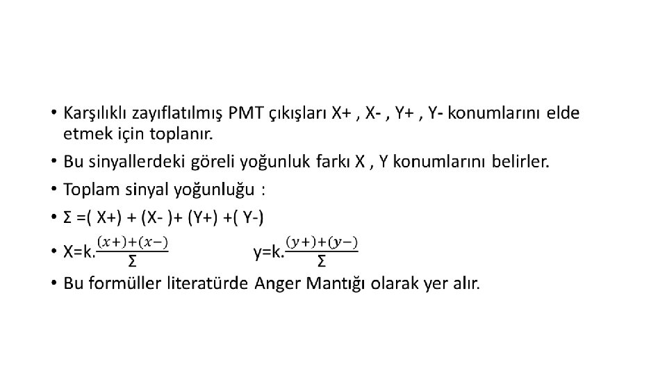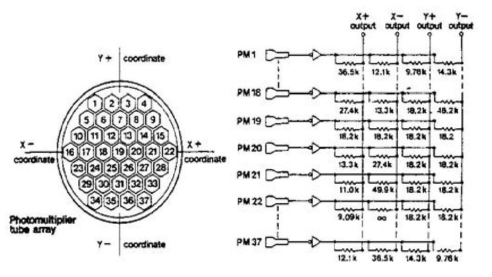 POZİSYONLAYICI MANTIK DEVRESİ • PMT çıkışında oluşan sinyalleri kullanarak pozisyonların saptanmasını ifade eder. • Tüplerin çıkışından konum bilgisi elde edebilmek için dirençli bir ağ yapısı kullanılır. • Şekildeki 7 PMT nin her birinin çıkışı dört dirençle zayıflatılır. Merkezdeki PMT aynı değere sahip dirençlerle zayıflatılırken diğer PMT ler pozisyonlarına bağlı olarak bağlanan dirençlerle zayıflatılır.