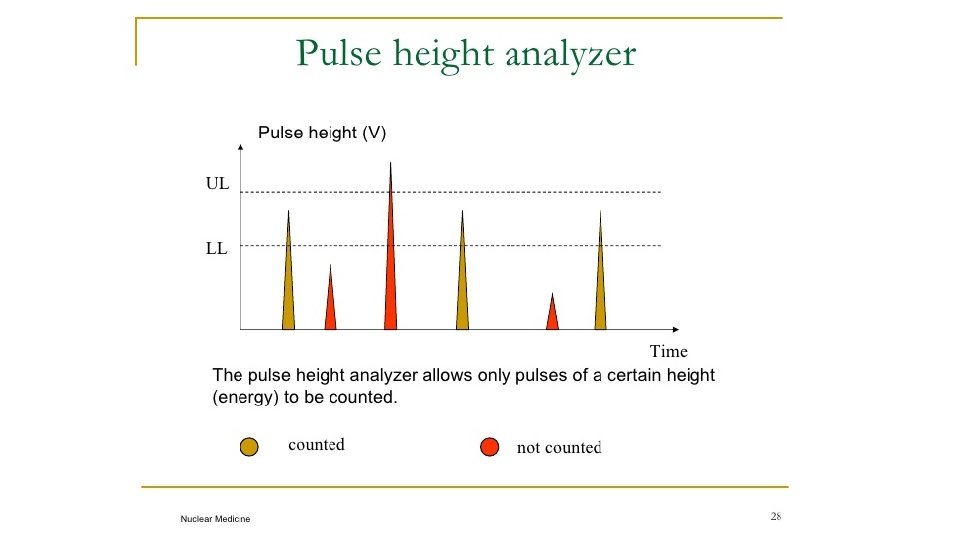 PULS YÜKSEKLİK ANALİZÖRÜ(PHA) • Puls yüksekliği analizörü" veya "selektör" (seçici), belirlenen en düşük değerin altındaki ve en yüksek değerin üstündeki tüm pulsların tümünü atan bir elektronik devredir; yani, sınırlandırılmış bir puls yükseklikleri "kanalı"ıveya "pencere"si içinde kalan pulslar dışındaki tüm pulslar atılır.