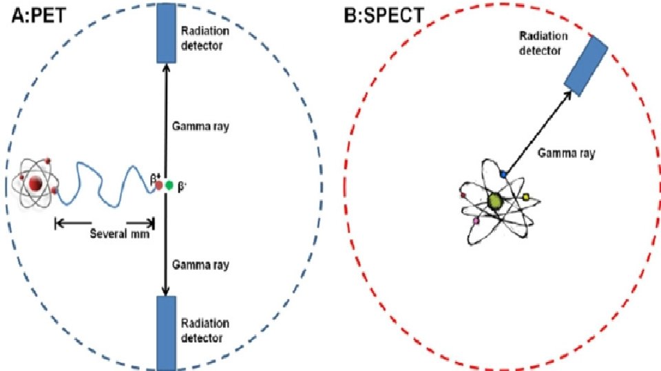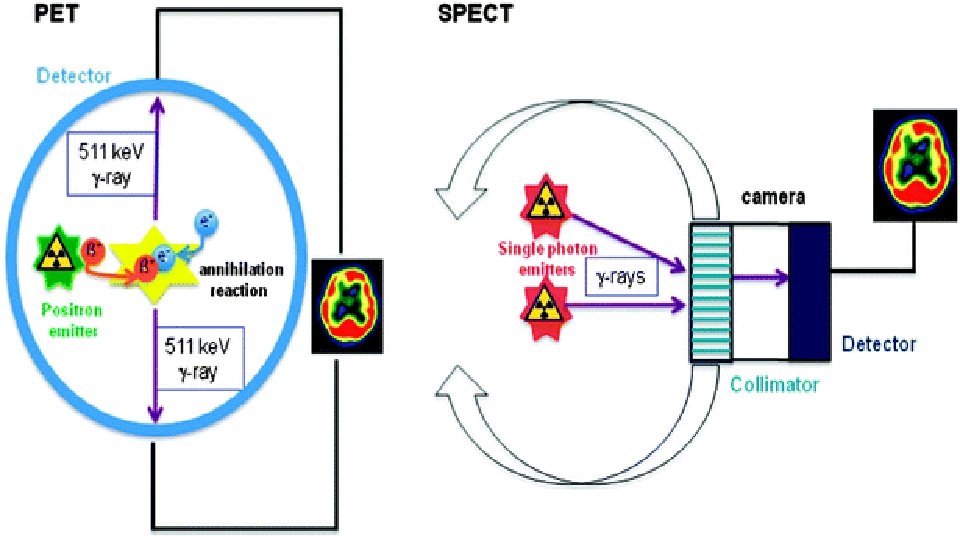 SPECT GÖRÜNTÜLEME ve PET GÖRÜNTÜLEMENİN TEMEL FARKLARI • SPECT, PET e göre daha ucuz bir sistemdir. • SPECT te gama ışını yayan radyoizotoplar kullanılırken PET te pozitron yayan radyoizotoplar kullanılır. • SPECT, PET e göre daha düşük kontrast ve çözünürlüğe sahiptir. • SPECT radyoizotopları hastada daha uzun süre kalır ve genellikle miyokard perfüzyonun görüntülenmesi için kullanılırken PET radyoizotopları daha kısa yarılanma ömrüne sahip, daha yüksek enerjilidir ve genellikle beyin görüntüleme için kullanılır. • SPECT ve PET te kullanılan detektörler farklıdır.