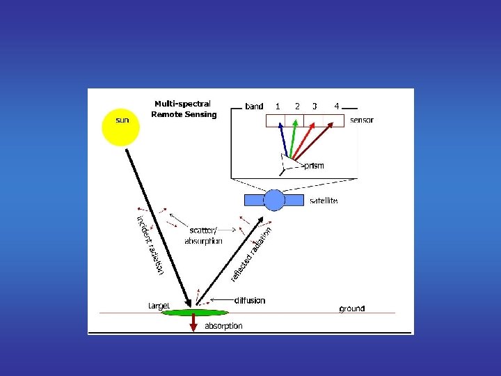 Visible Blue Band (. 45 -. 52 microns) ► Greatest water penetration ► Greatest atmospheric scattering ► Greatest absorption ► Used for : water depth water characteristics detection of subsurface features soil and vegetation discrimination forest, geology, cultural features