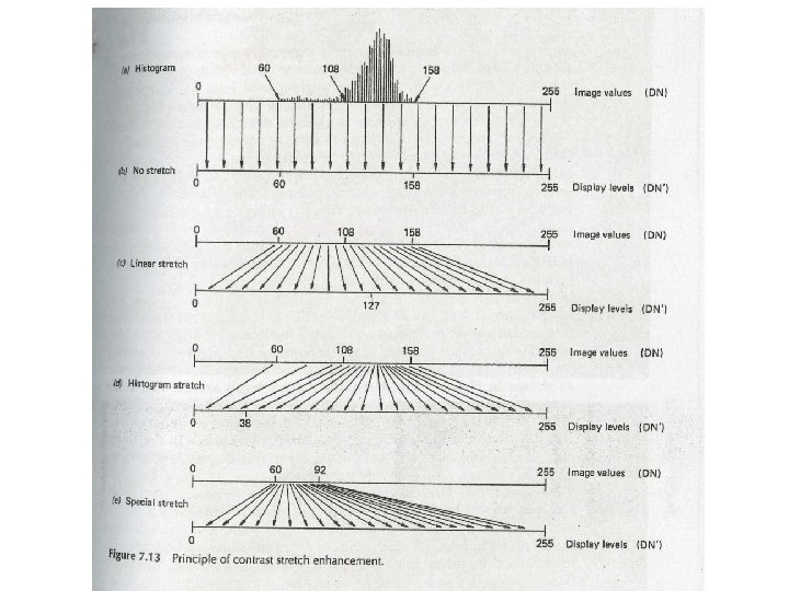 Histogram Conversion The histogram of the original image is converted to other types of histograms as specified by user � Histogram Stretch- Image values are assigned to the display levels on the basis of their frequency of occurrence � More display values ( more radiometric details) are assigned to the frequently occurring portion of histogram � Special Stretch- To analyze specific features in greater radiometric detail s by assigning the display range exclusively to a particular range of image values
