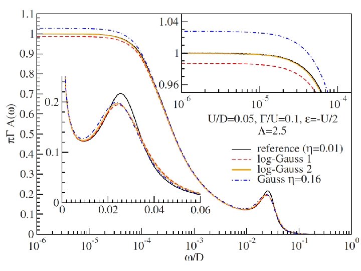 Density-matrix NRG • Problem: Higher-energy parts of the spectra calculated without knowing the true ground state of the system • Solution: 1) Compute the density matrix at the temperature of interest. It contains full information about the ground state. 2) Evaluate the spectral function in an additional NRG run using the reduced density matrix instead of the simple Boltzmann weights.