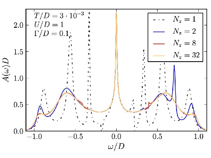 Non-orthodox approach: analytic continuation usng Padé approximants We want to reconstruct G(z) on the real axis. We do that by fitting a rational function to G(z) on the imaginary axis (the Matsubara points). This works better than expected. (This is an ill-posed numerical problem. Arbitrary-precision numerics is required. ) Ž. Osolin, R. Žitko, ar. Xiv: 1302. 3334