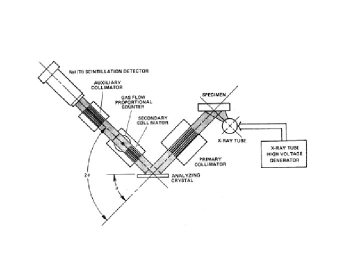 Components • An X-ray spectrometer consists of five main components: – The X-ray tube – The specimen chamber – The collimators – The crystal – The detector