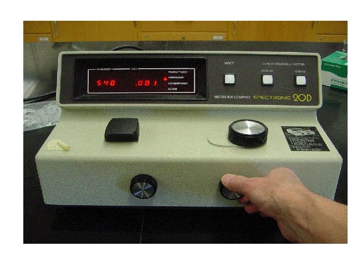 I. How to use the spectrophotometer (Spec 20/20 D) 1. Turn on the instrument and let it warm up for at least 5 -10 minutes. 2. Select the wavelength with the dial next to the sample compartment. 3. With the sample compartment closed and empty, adjust the % Transmittance (zero percent transmission of light) to read 0% T using the left front dial. 4. Place a clean (no fingerprints), dry cuvette filled approximately 3/4 full of the blank sample (solvent only) in the sample compartment. Close the sample compartment. Adjust the % Transmittance to read 100% T (100 percent transmission of light) using the right front dial. 5. Remove the blank cuvette and place the cuvette containing the sample in the sample compartment. Close the sample compartment. Read and record the value registered on the meter. Note: Every time the wavelength of light is changed, the instrument must be recalibrated to read 0% T and 100% T with the blank. Repeat steps 2 -5.