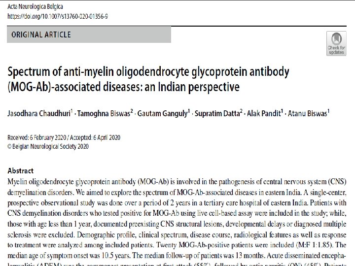 MYELIN OLIGODENDROCYTE GLYCOPROTEIN–ASSOCIATED DISORDERS Clinical phenotype overlaps with patients with ADEM and NMOSD. MOG-Ab is present in more than 30% of children presenting with an initial episode of demyelination. Up to 50% of cases of ADEM have been found to be associated with MOG-Ab positivity in the serum Almost all cases of MDEM are MOG-Ab positive.