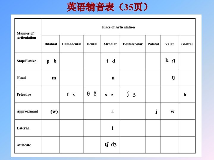 2. 2. 1 Consonants The categories of consonant are established on the basis of several factors. The most important of these factors are: 1. the actual relationship between the articulators and thus the way in which the air passes through certain parts of the vocal tract (manner of articulation); 发音方式 2. where in the vocal tract there is approximation, narrowing, or the obstruction of the air (place of articulation). 发音部位