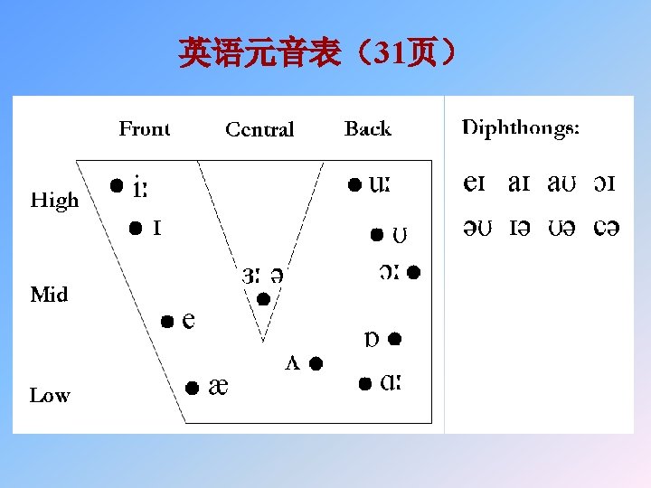 英语元音表 • [i: ] high front tense unrounded vowel [u] high back lax rounded vowel