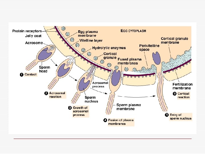 (A) Sperm başı (akrozom reaksiyonundan önce); acp, akrosomal kap; eq, ekvatoryal bölge. (B-C) Akrozom-reaksiyonu geçirmiş spermatozoon zona pellusida (zp) ve perivitellin aralığı (pvs) geçiyor. (D-E) Akrozomun ekvatoryal segmenti (eq) üzerindeki sperm plazma membranı ve oosit plazma membranı arasında membran füzyonu başlıyor. Polispermik fertilizasyonu önlemek için kortikal granüller (cg) hızla ekzositoza uğrayarak oosit yüzeyi ve zona pellusidayı modifiye ediyor. (F-G) Sperm başının anterior bölgesi fagositik şekilde oositin içine giriyor, sperm başının diğer kısımları ve kuyruk ise plazma membran füzyonu vasıtasıyla oositin içine girer. Akrosomal kap parçaları kesinlikle oositin içine girmez. Sperm plazma membranı da oositin içine girer : oosit plazma membranı ile karışarak zigotun plazma membranının mozaik olmasına neden olur. (H) İç akrozomal membran (iam) dekondense olan sperm nukleusundan ayrılır. Endoplazmik retikulum (er) erkek pronukleus zarını oluşturur.