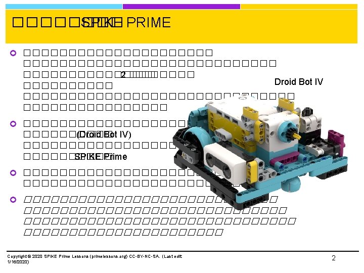 DROID BOT IV Droid Bot IV ���������������� SPIKE Prime Set (45678) ������� Expansion Set ������������������� 56 mm ������������������� Droid Bot IV Configuration Copyright © 2020 SPIKE Prime Lessons (primelessons. org) CC-BY-NC-SA. (Last edit: 1/16/2020) 3