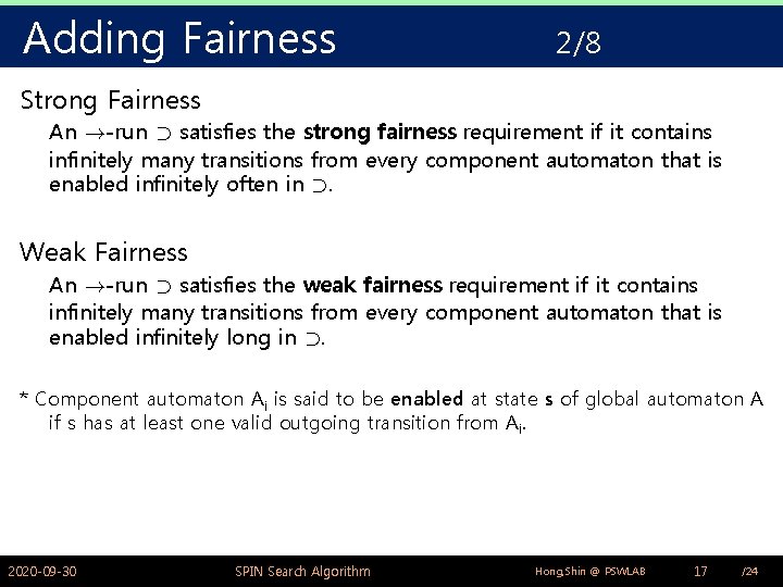 Adding Fairness 2/8 Strong Fairness An !-run ¾ satisfies the strong fairness requirement if it contains infinitely many transitions from every component automaton that is enabled infinitely often in ¾. Weak Fairness An !-run ¾ satisfies the weak fairness requirement if it contains infinitely many transitions from every component automaton that is enabled infinitely long in ¾. * Component automaton Ai is said to be enabled at state s of global automaton A if s has at least one valid outgoing transition from Ai. 2020 -09 -30 SPIN Search Algorithm Hong, Shin @ PSWLAB 17 /24