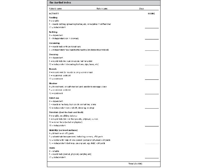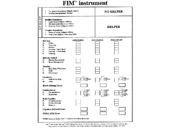 Functional Assessment Functional Independence Measure Self Care Sphincter Control Transfers Locomotion Communication Social Cognition Barthel Index Feeding Bathing Grooming Transfers-Chair, Bed Dressing Ambulation Bowels Bladder Toilet Transfer Stair Climbing