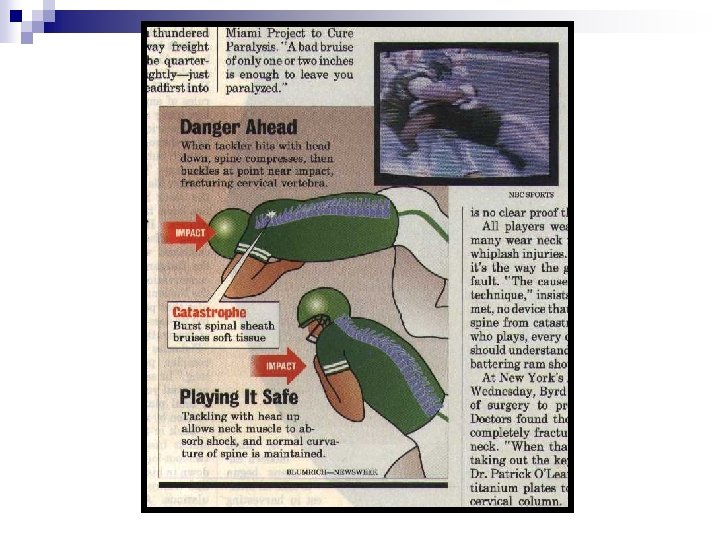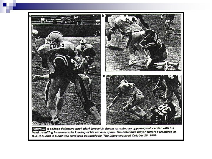 Cervical Fracture n n n In 1976 the NCAA banned spearing. Since then spinal injuries dropped from 110 to 40 and players rendered quad. dropped from 34 to 5. 3 From 1984 to 1987, 24 US players sustained permanent injury, 100 additional players recent temporary damage. Since 1977 the incidence rate is 0. 6/100, 000 high school players and 1. 69/100, 000 college players. 2