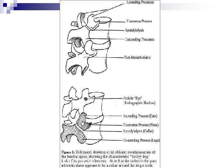 Spondylolysis n n n The stress fracture can weaken the bone so much that it is unable to maintain its proper position and the vertebra slip out of place. If too much slippage occurs, the bones may begin to press on nerves and surgery may be necessary to correct the condition. Causes: ¨ Genetics: There may be a hereditary aspect to spondylolysis. An individual may be born with thin vertebral bone and therefore be vulnerable to this condition. Significant periods of rapid growth may encourage slippage. ¨ Overuse: Some sports, such as gymnastics, weight lifting and football, put a great deal of stress on the bones in the lower back. They also require that the athlete constantly over-stretch (hyperextend) the spine. In either case, the result is a stress fracture on one or both sides of the vertebra. ¨ Sports requiring weight-loading, rotation, and/or hyper extension are high risk.