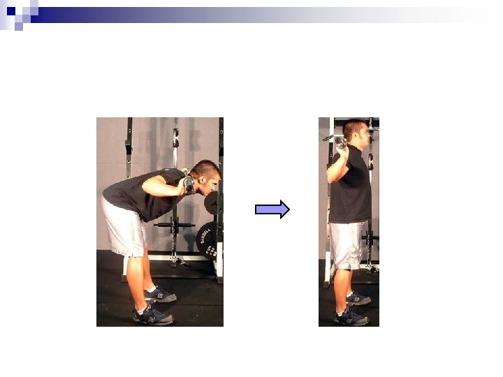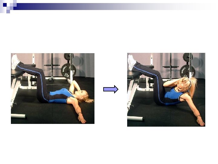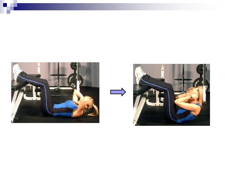 Abdominal Exercises n n When the trunk is flexed with the thigh fixed, the hip flexors contract in this position and pull the lumbar region of the back inward, increasing the inward lumbar curve. An imbalance between the hip flexors and the abdominal muscles can lead to postural increases in the lumbar region resulting in lordosis, herniation of the intervertebral disks, and pinching of the nerves in the lower back.