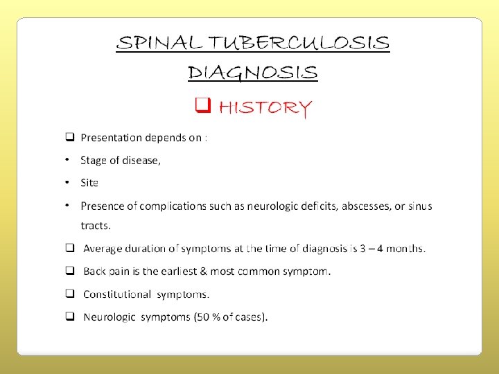 SPINAL TUBERCULOSIS DIAGNOSIS • RADIOLOGICAL DIAGNOSIS • 1. PLAIN RADIOGRAPH • 2. CT SCAN • 3. MRI SPINE • 4. BONE SCAN TB bacilli are rarely found in CSF, therefore imaging plays pivotal role in suggesting the diagnosis.