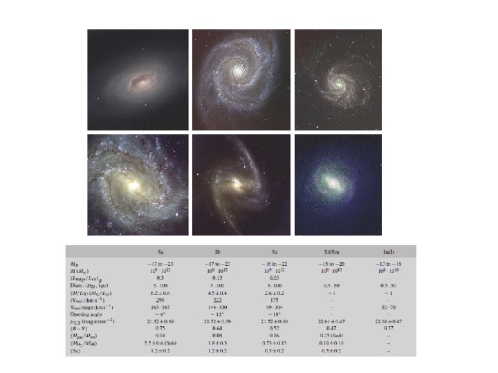 Spiral Galaxies • Compared to ellipticals, the spirals cover a distinctly smaller range in absolute magnitude (and mass). They are limited to − 16 > MB > − 23 and 109 M < סּ M < 1012 M סּ • Looking at the sequence of early-type spirals (i. e. , Sa’s or SBa’s) to late-type spirals, we find a number of differences that can be used for classification • a decreasing luminosity ratio of bulge and disk, with Lbulge/Ldisk ~ 0. 3 for Sa’s and ~ 0. 05 for Sc’s • an increasing opening angle of the spiral arms, from ~ 6◦ for Sa’s to ~18◦ for Sc’s; • an increasing brightness structure along the spiral arms: Sa’s have a “smooth” distribution of stars along the spiral arms, whereas the light distribution in the spiral arms of Sc’s is resolved into bright knots of stars and HII regions.