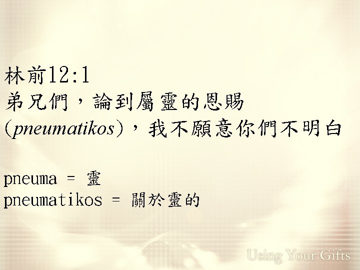 What makes a gift/ability “spiritual”? 1. 聖經中有提到的 vs. 聖經中沒有提到的? In the Bible vs. Not in the Bible? Bible NOT meant to have a complete list of gifts 2. 神蹟奇事、超自然能力 vs. 自然能力? Supernatural ability vs. Natural ability? No clear distinguishing of Supernatural vs. Natural 3. 聖靈直接賜給的vs. 不是聖靈直接給的? Directly from the Holy Spirit vs. Indirectly? Everything is from God (Father, Son, Holy Spirit) Supernatural ability – power source = Holy Spirit