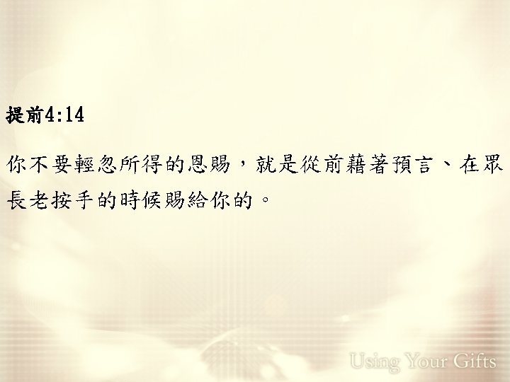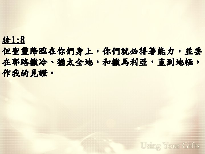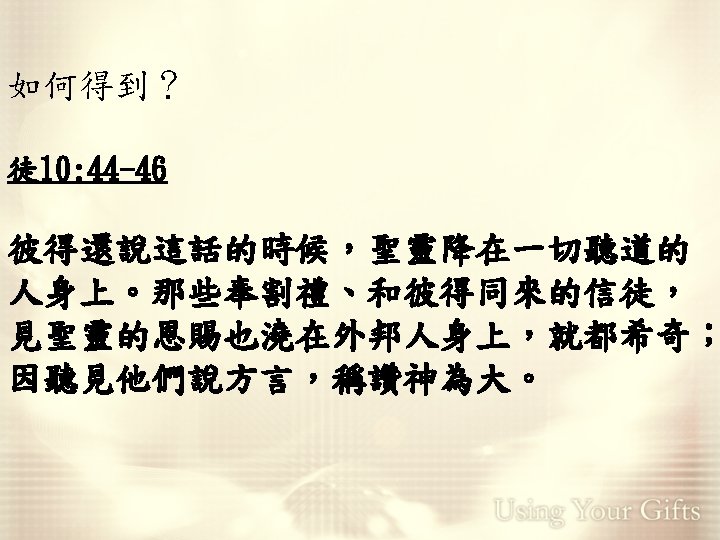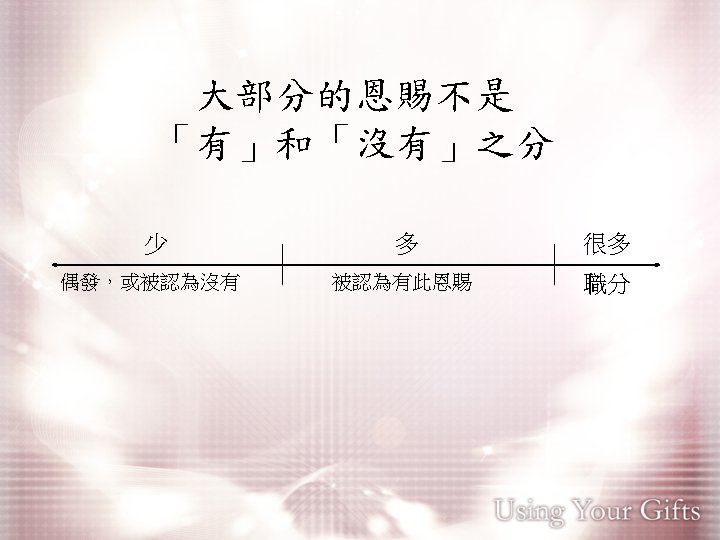 What makes a gift/ability “spiritual”? 1. 聖經中有提到的 vs. 聖經中沒有提到的? In the Bible vs. Not in the Bible? 2. 神蹟奇事、超自然能力 vs. 自然能力? Supernatural ability vs. Natural ability? 3. 聖靈直接賜給的vs. 不是聖靈直接給的? Directly from the Holy Spirit vs. Indirectly? 只有動機和目的,才有屬靈/不屬靈的分別! Motivation and Purpose : Spiritual or not? What do you do with your gift? And why?