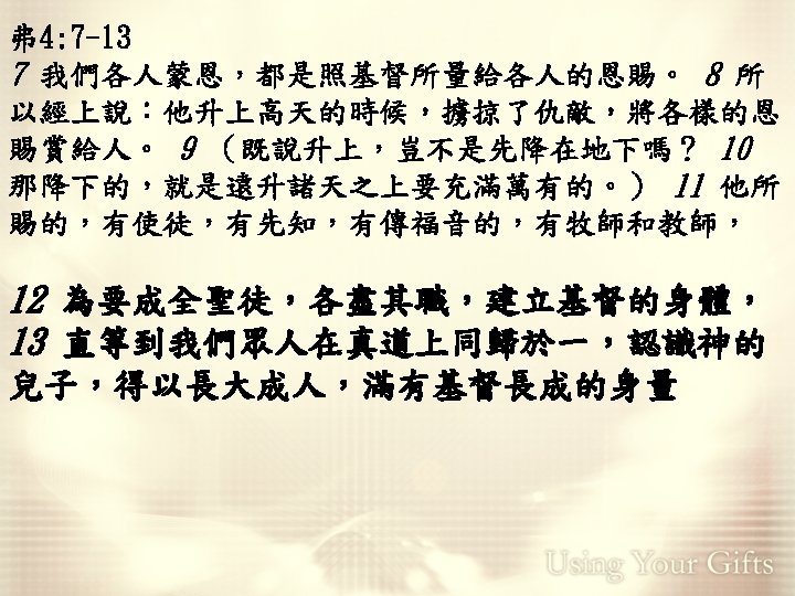 I Corinthians 哥林多前書 12: 4 -7, 11 -12 4 恩賜原有分別,聖靈卻是一位。 5 職事也有分別,主卻 是一位。 6 功用也有分別, 神卻是一位,在眾人裡面運 行一切的事。 7 聖靈顯在各人身上,是叫人得益處… 11 這一切都是這位聖靈所運行、隨己意分給各人的。 12 就 如身子是一個,卻有許多肢體;而且肢體雖多,仍是一個 身子;基督也是這樣。 4 There are diversities of gifts, but the same Spirit. 5 There are differences of ministries, but the same Lord. 6 And there are diversities of activities, but it is the same God who works all in all. 7 But the manifestation of the Spirit is given to each one for the profit (of all)… 11 But one and the same Spirit works all these things, distributing to each one individually as He wills. 12 For as the body is one and has many members, but all the members of that one body, being many, are one body, so also is Christ.