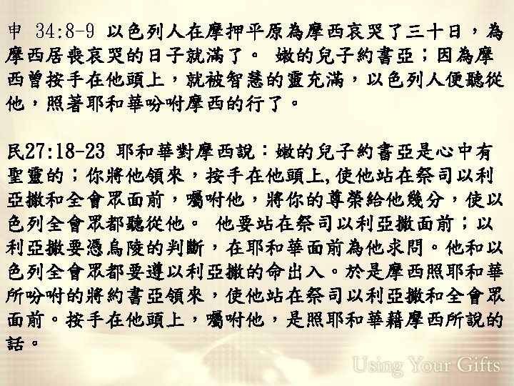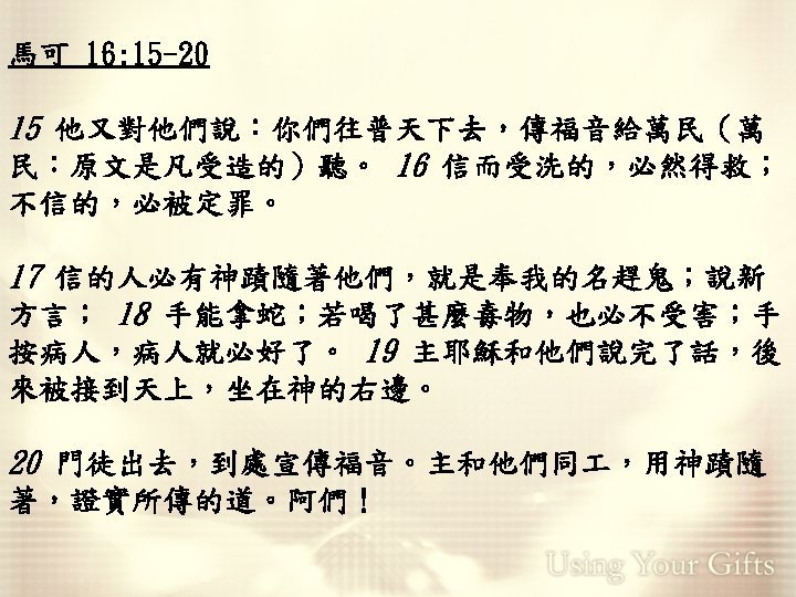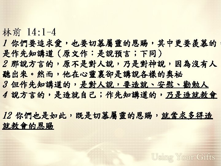 I Corinthians 哥林多前書 12: 8 -10 8 這人蒙聖靈賜他智慧的言語,那人也蒙這位聖靈 賜他知識的言語, 9 又有一人蒙這位聖靈賜他信心, 還有一人蒙這位聖靈賜他醫病的恩賜, 10 又叫一 人能行異能,又叫一人能作先知,又叫一人能辨別 諸靈,又叫一人能說方言,又叫一人能繙方言。 8 for to one is given the word of wisdom through the Spirit, to another the word of knowledge through the same Spirit, 9 to another faith by the same Spirit, to another gifts of healings by the same Spirit, 10 to another the working of miracles, to another prophecy, to another discerning of spirits, to another different kinds of tongues, to another the interpretation of tongues.