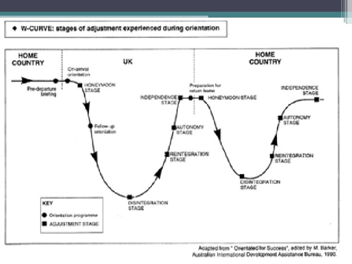 The U or W Model • Beyond Culture Shock is a second set of shocks • Reverse Culture Shock (a. k. a. "Re-entry Shock", or "own culture shock"[5]) may take place — returning to one's home culture after growing accustomed to a new one can produce the same effects as described above. This results from the psychosomatic and psychological consequences of the readjustment process to the primary culture. [6] The affected person often finds this more surprising and difficult to deal with than the original culture shock.