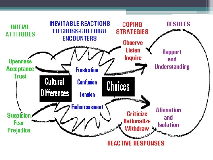 Sickness Model of Culture Shock • Culture stress follows patterns of other kinds of stress. • Culture shock occurs when stress reaches levels reach unmanageable levels where unusual, uncontrollable reactions (coping mechanisms) occur • These often relate back to early childhood patterns of coping or maladjusted reacting. ▫ Usually fight (aggression) or flight (retreat into silence, depression) • Do you remember a grief reaction at loss of identity, loss of status, loss of family? These are likely to recur.
