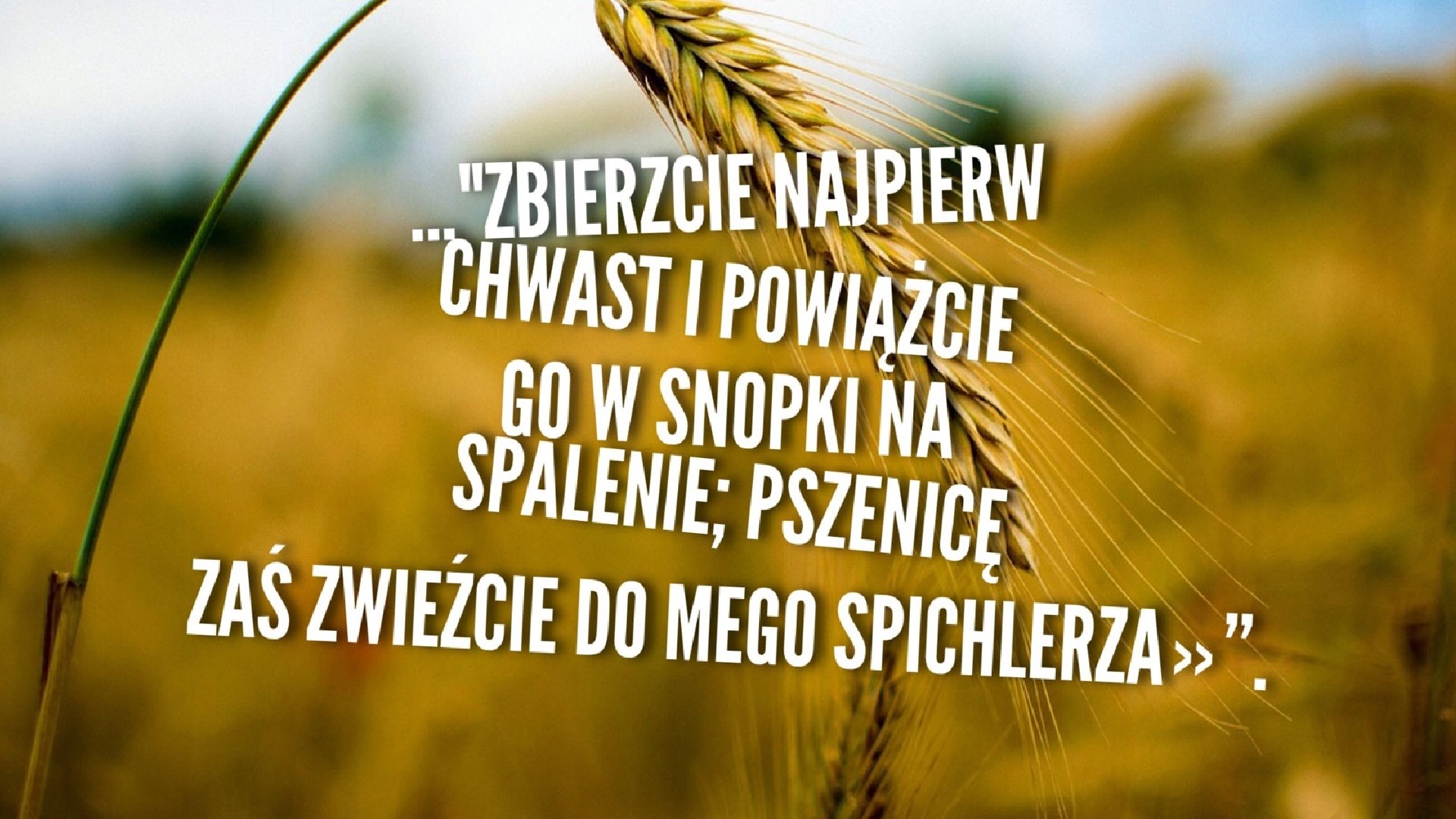 i pszenicy. Pozwólcie obojgu róść aż do żniwa; a w czasie żniwa powiem żeńcom: Zbierzcie najpierw chwast i powiążcie go w snopki na spalenie; pszenicę zaś zwieźcie do mego