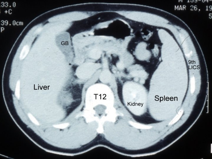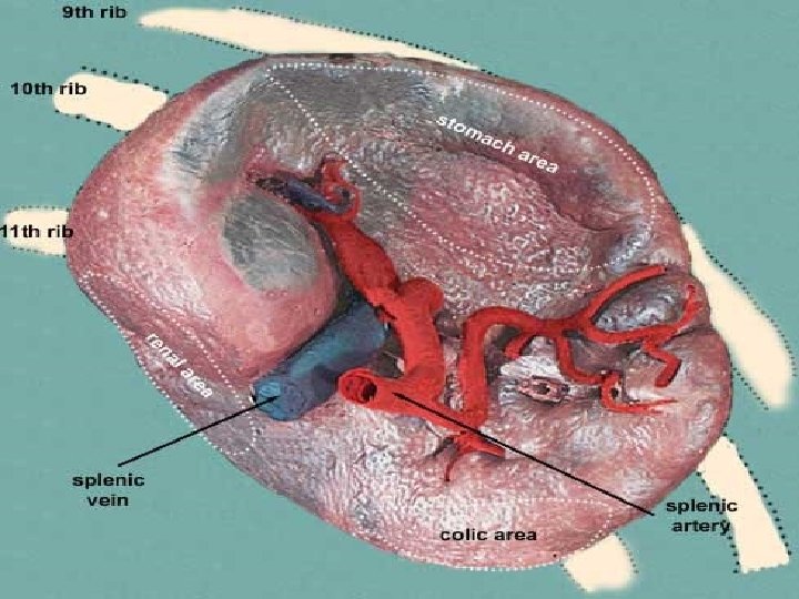 Anatomy: Spleen -Wt 75 -250 gm, LUQ, along 10 th rib, between gastric fundus &L hemidiaphragm. -Hilum: In the angle between stomach & L kidney, I n contact with tail of pancreas. -Concave Visceral surface: impressions. -Notch: infero lateral border, palpate in splenomegaly.