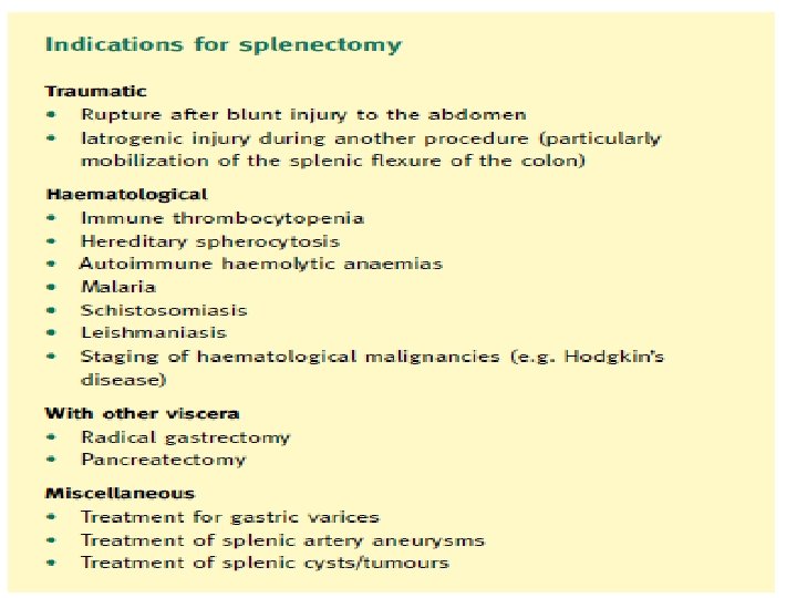 Splenectomy for Blood ds 2 -Haemolytic Anaemias: 1 -Hereditary Spherocytosis. 2 -Sickel cell anaemia. 3 -Thalassaemia. 4 -Acquired autoimmune haemolytic anaemia