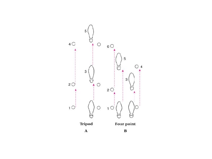 • Walking with Cane or Crutch – Corresponds to walking – Tripod method • Swing through without injured limb making contact with ground – Four- point crutch gait • Foot and crutch on same side move forward simultaneously with weight bearing