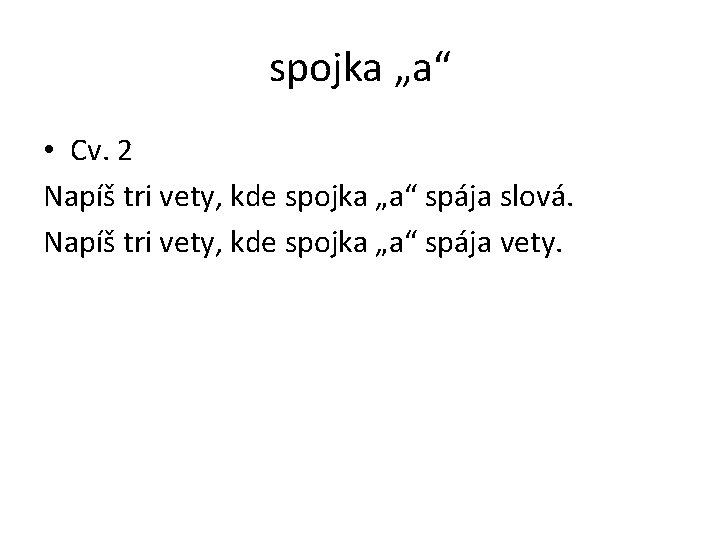 spojka „a“ • Cv. 2 Napíš tri vety, kde spojka „a“ spája slová. Napíš tri vety, kde spojka „a“ spája vety.