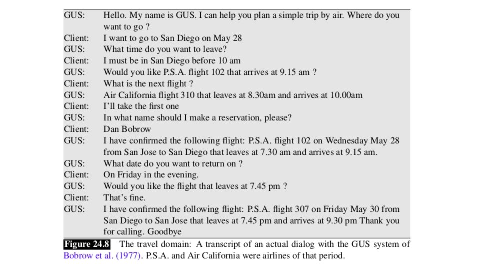 Frame-based dialogue system • Architecture introduced in GUS travel planning system (Bobrow et al. , 1977) • This architecture is used in most modern commercial digital assistants • Based on a domain ontology, which defines frames (collections of slots) and values that each slot can take