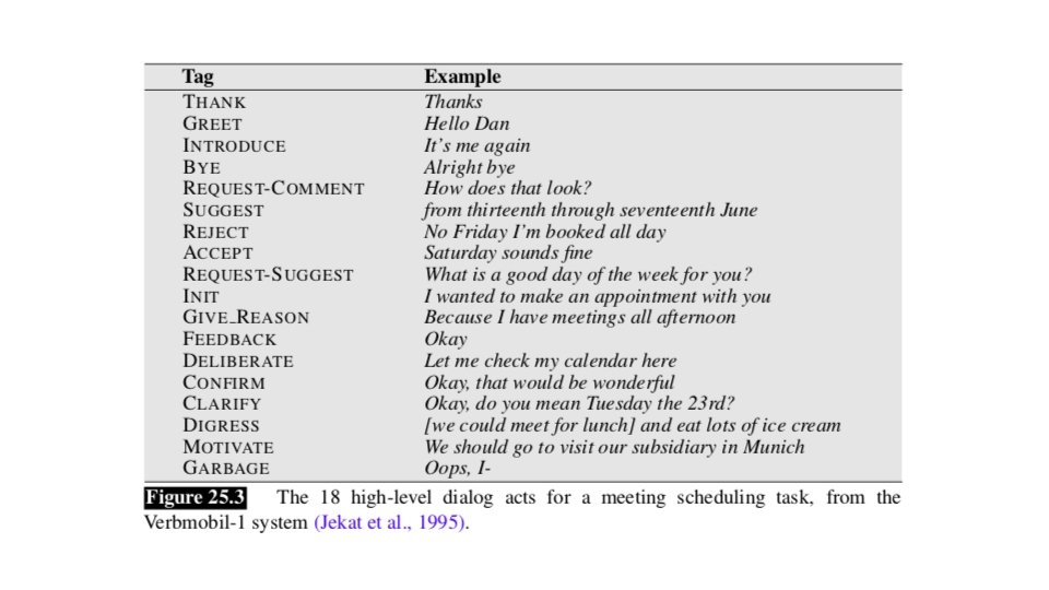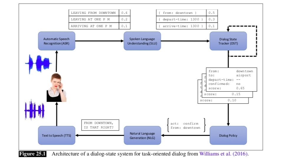 Dialogue-state architecture • Capable of understanding and generating dialogue acts • Dialogue acts: utterance in the context of a dialogue that serves a function in the dialogue • e. g. question, statement, request for action, acknowledgment • Dialogue policy – decide what to say • Dialogue state tracker – maintain the current state of the dialogue
