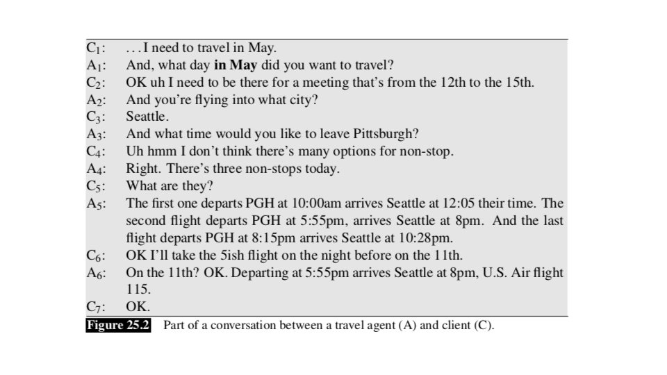 NLU for filling slots • Domain classification • Intent determination • Slot filling “Show me morning flights from Boston to San Francisco on Tuesday” DOMAIN: AIR-TRAVEL INTENT: SHOW-FLIGHTS ORIGIN-CITY: Boston ORIGIN-DATE: Tuesday ORIGIN-TIME: morning DEST-CITY: San Francisco
